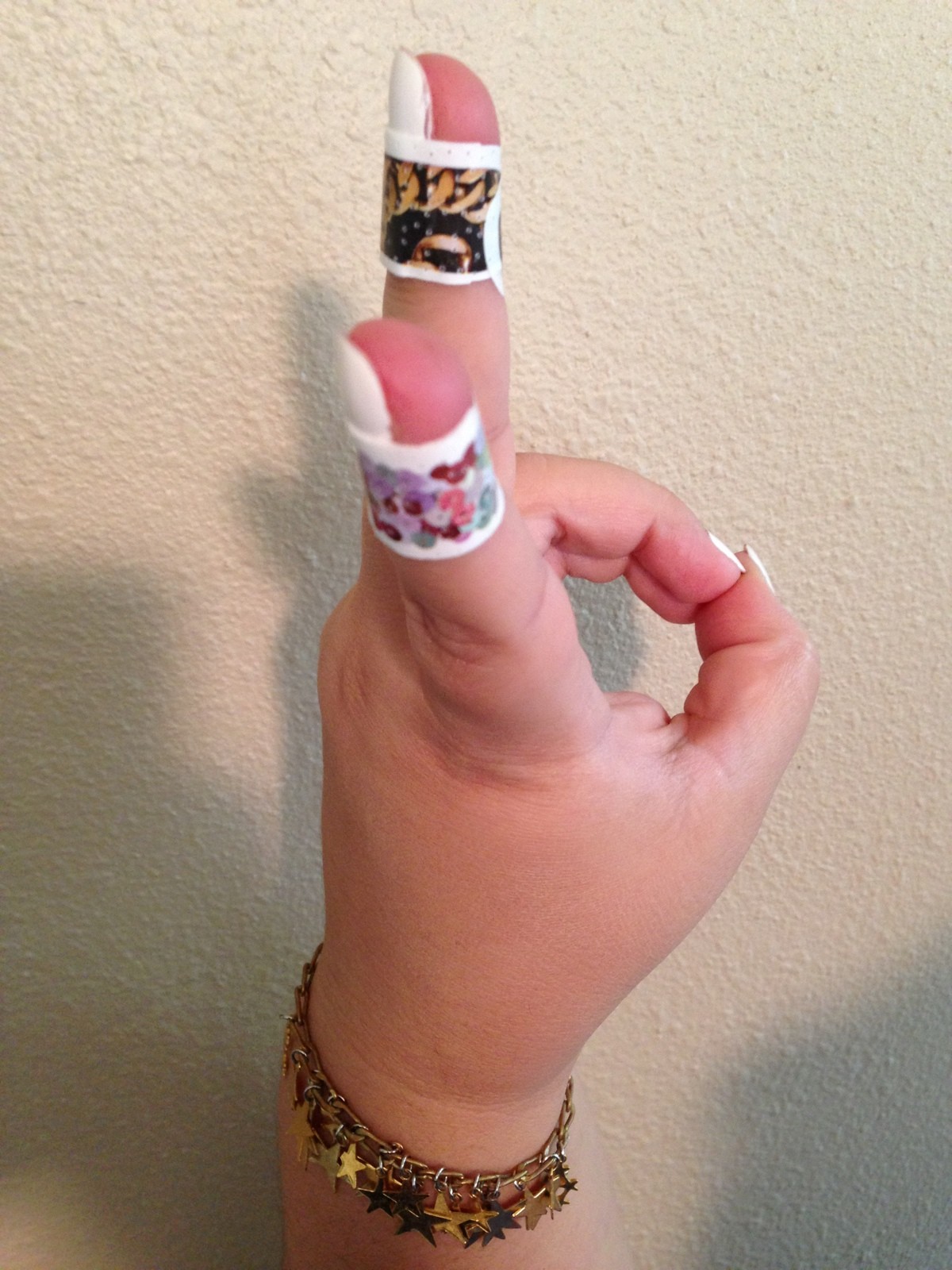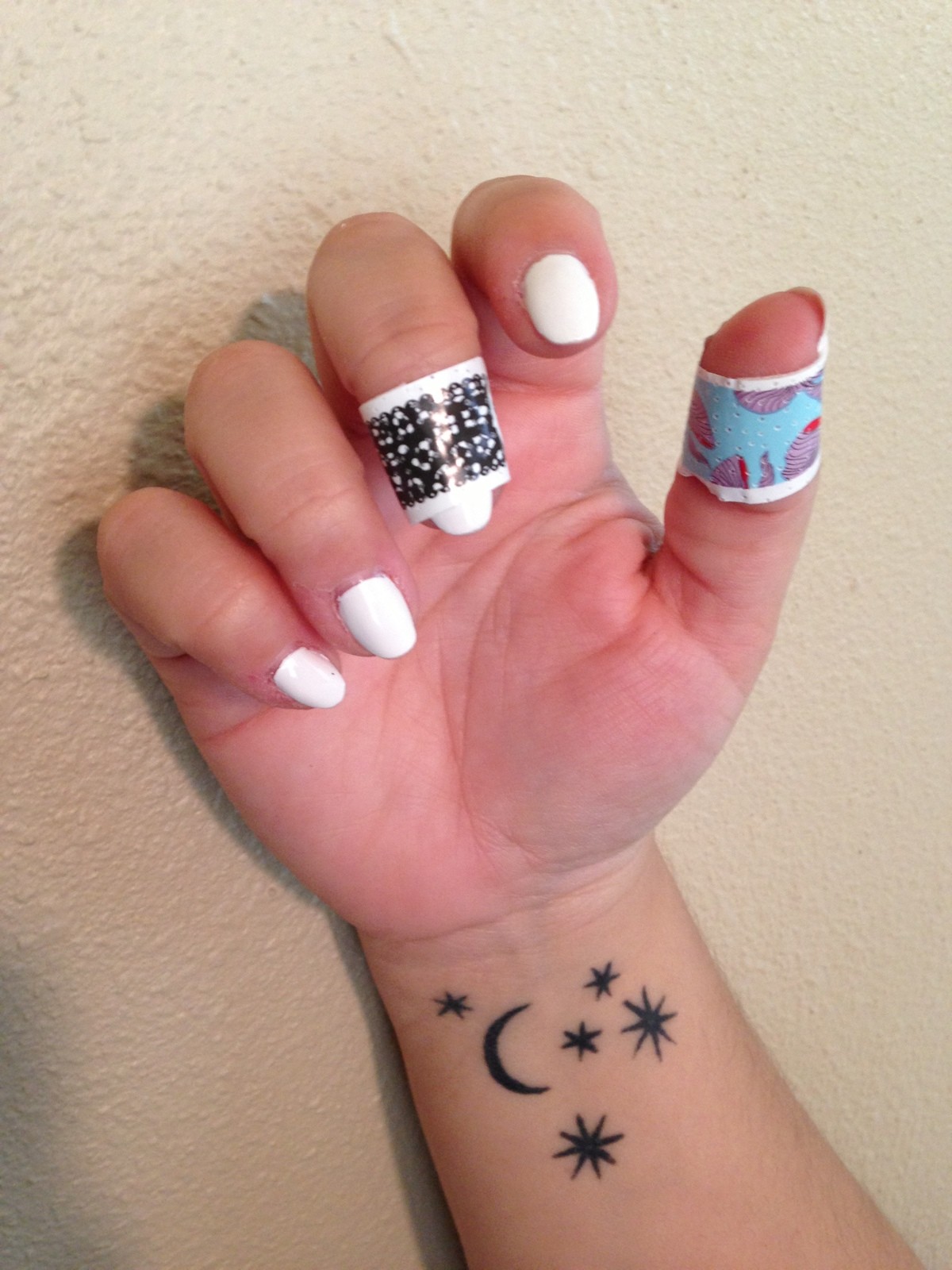 I wasn’t joking about showing you the Band-Aids I use to cover my poor fingers. The one with the gold chains is my favorite! I wish I could get a whole box of just those.